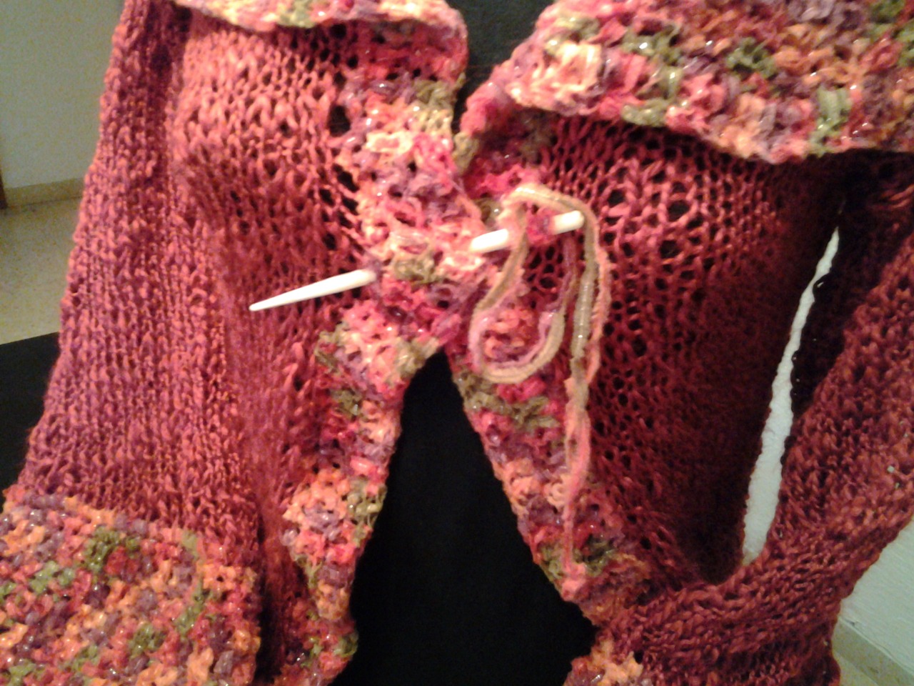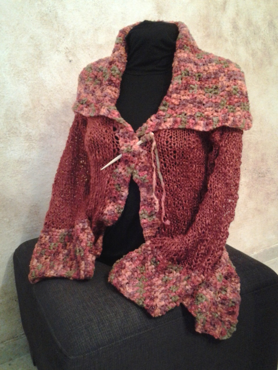 Chaqueta realizada en combinación de material el cuerpo esta tejida en lana flamé (se caracteriza por los diferentes grosores que presenta) y la parte central, inferiores y gran cuello en cinta multicolor al tono. Detalle de aguja de madera para cerrar en la parte frontal o utilizar como broche.