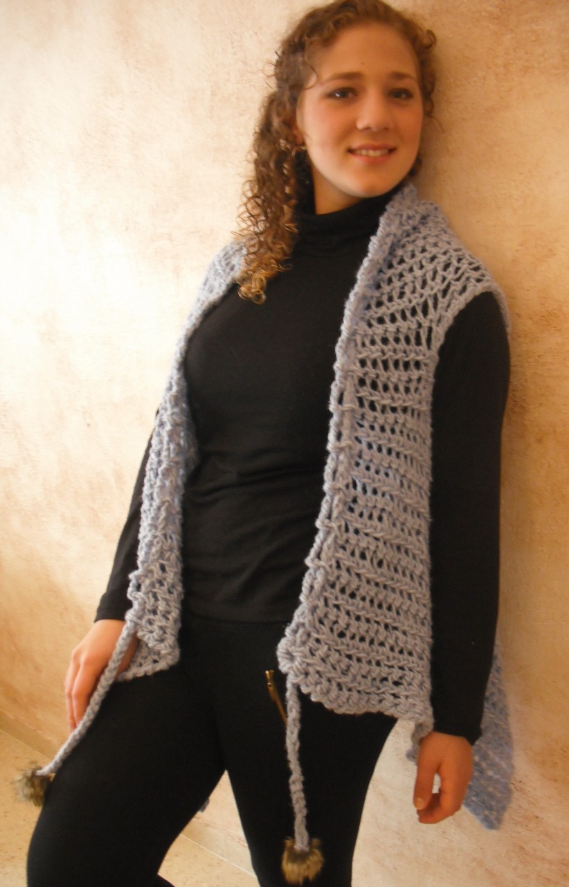 Esta prenda está confeccionada en hilatura muy suave con un tenue brillo. Su formato da la posibilidad de jugar a la hora de utilizarla, teniendo varias prendas en una sola.