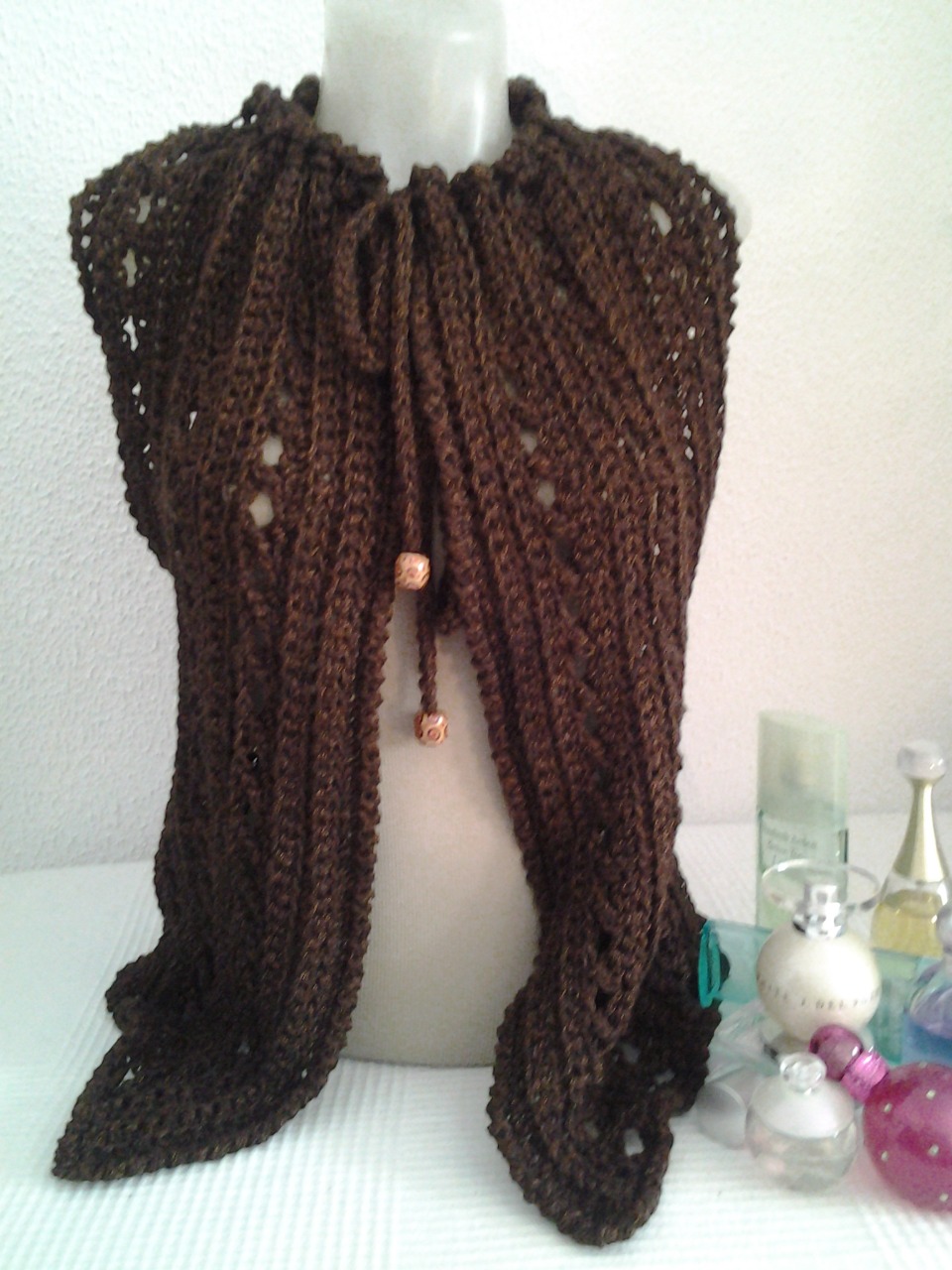 Esta prenda está diseñada para se utilizada de varias formas, según se ajuste el cordón. Realizado en hilado bicolor marrón y lamé cobre, que le otorga un toque de brillo. El cordón del cuello termina con cuentas grandes de madera al tono.