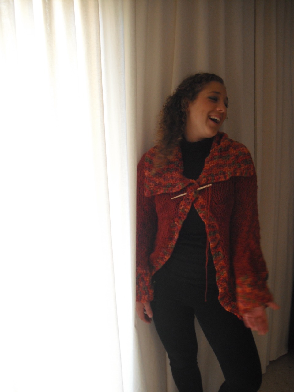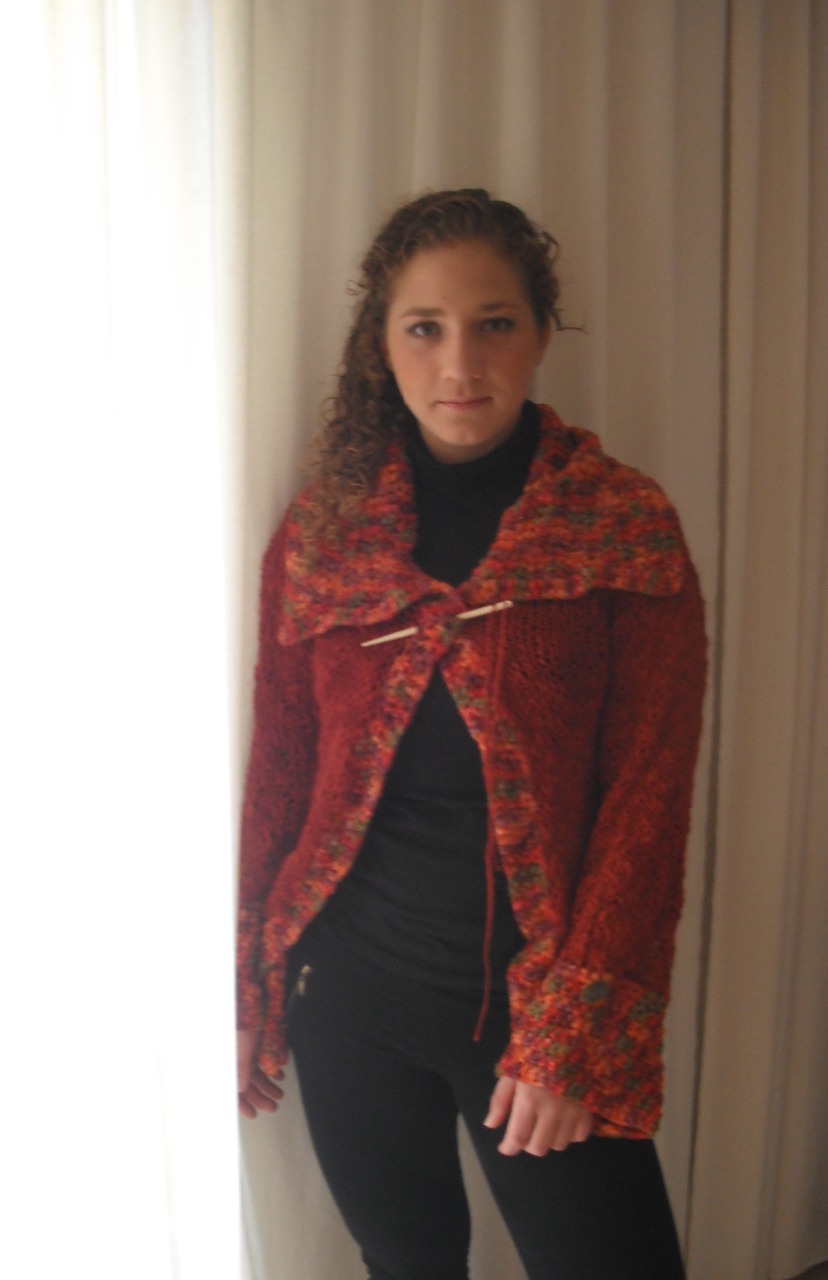 Chaqueta realizada en combinación de material el cuerpo esta tejida en lana flamé (se caracteriza por los diferentes grosores que presenta) y la parte central, inferiores y gran cuello en cinta multicolor al tono. Detalle de aguja de madera para cerrar en la parte frontal o utilizar como broche.